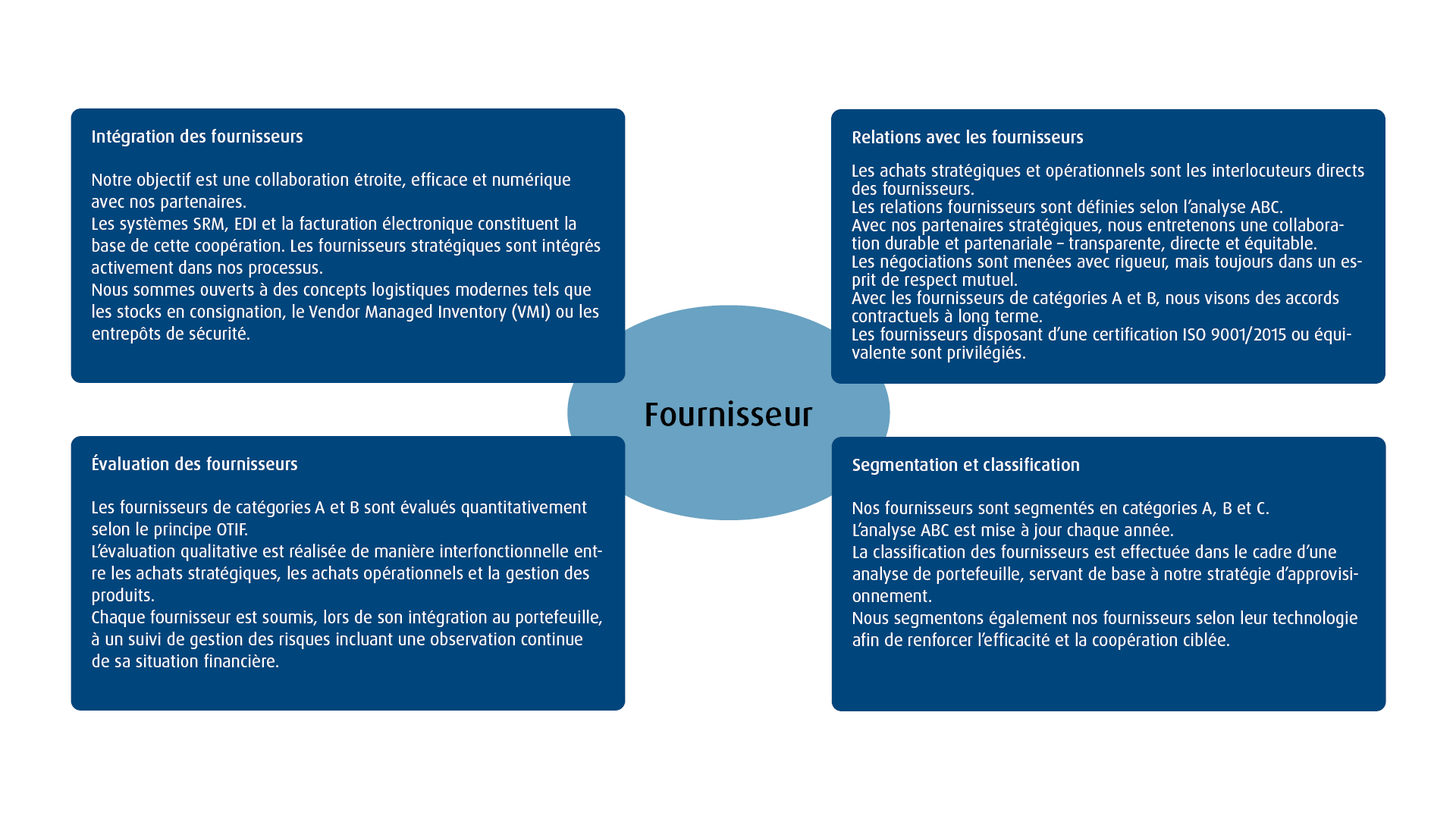 Pour réussir ensemble, nous attendons de nos partenaires: équité, capacité d’innovation et de coopération, transparence des coûts, prix conformes au marché, qualité, compétitivité et fiabilité.