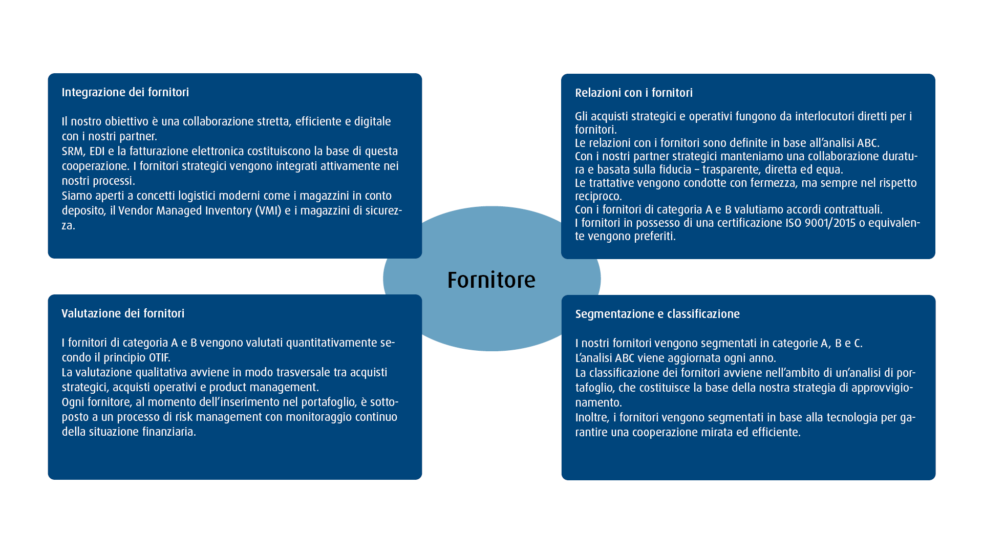 Il nostro obiettivo è una collaborazione equa, duratura e di successo. Insieme ai nostri fornitori garantiamo la massima qualità, efficienza dei costi, innovazione e un servizio eccellente.