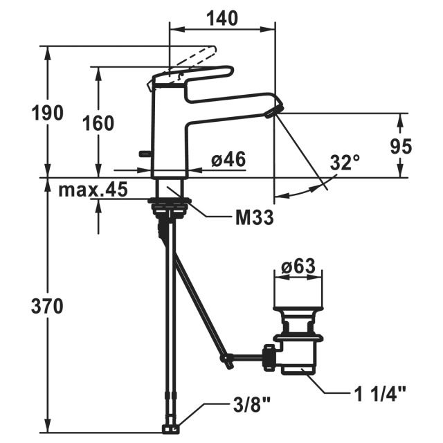 A 140 mm, bocca fissa, con valvola eccentrica, tubi di collegamento da 3/8", cromatura